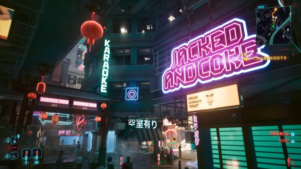 ここはジャパンタウン。サイバーパンクと言えばネオンKARAOKE看板だよね。