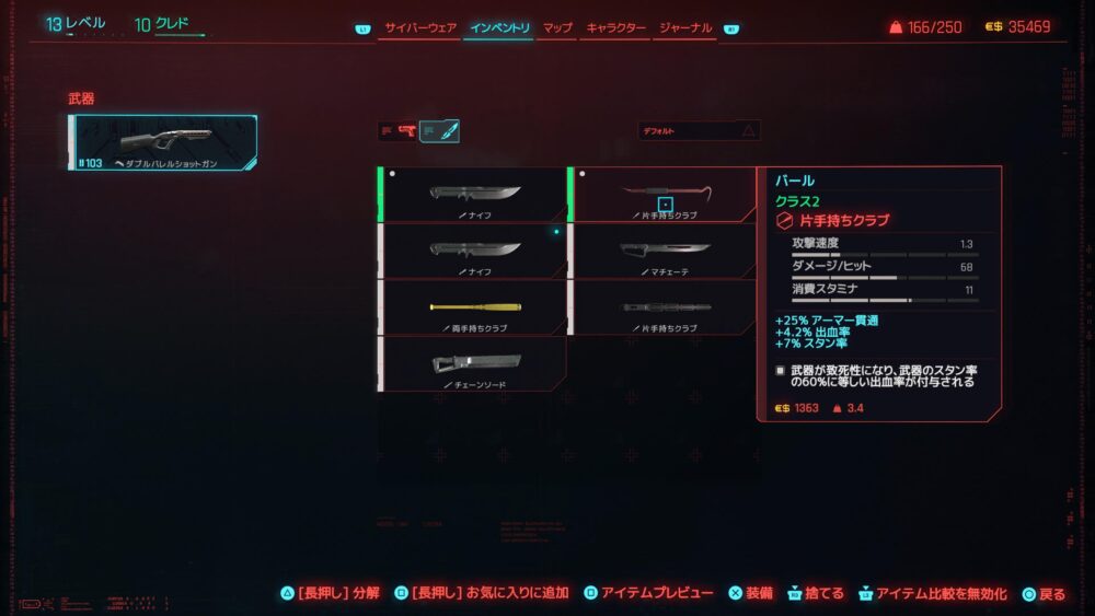 使ってる武器はバールと、両手持ちクラブ。バールはレアリティが高いけど致死性になっちゃうらしいです。そりゃそうだ。