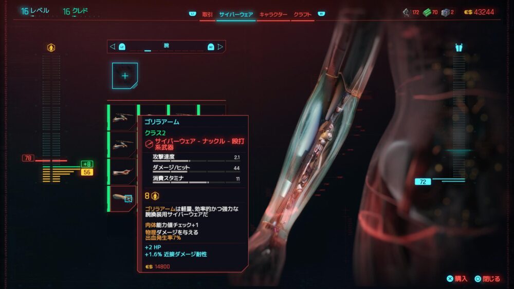 腕に埋め込むタイプのサイバーウェアは面白いものが多い。中でも気になるのはゴリラアーム。名前がもう好きだ。しかしサイバーウェアは装着できる限界があるみたいで、お金もかかるしそう気軽には買えませんね。