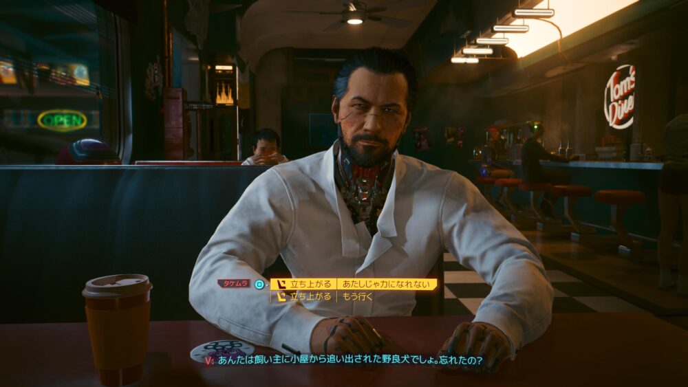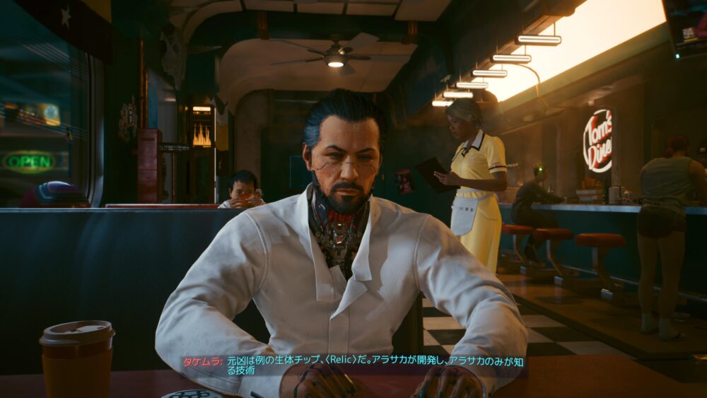 頭に銃撃を受けたVを助け、同時に殺そうとしているのがアラサカ社のRelicと呼ばれるチップ。その技術はアラサカ社のものなので、タケムラがどうにかしてアラサカ社を奪還した暁にはVの脳を戻せるかも。という話。にわかには信じられない内容だけど、Vもタケムラも後がない状況。