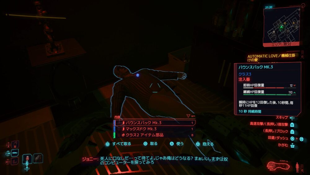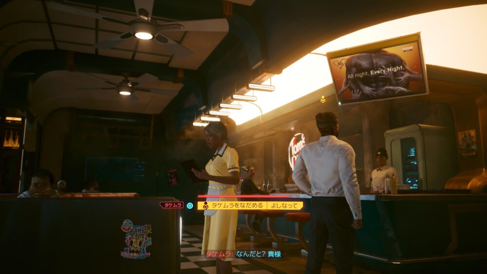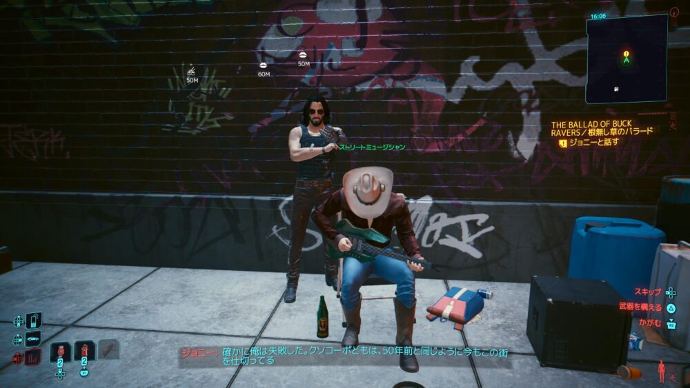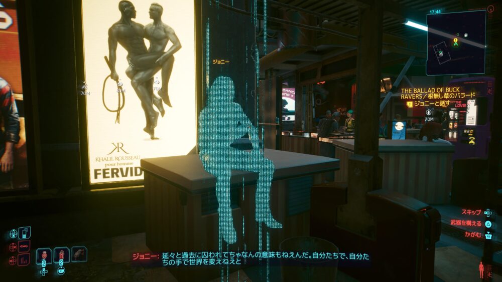 現れるジョニー。ジョニーは企業が嫌いなのでタケムラさんも嫌いだそうです。しかし今のところはVの頭の中にいるジョニーが一番信用できないという。
