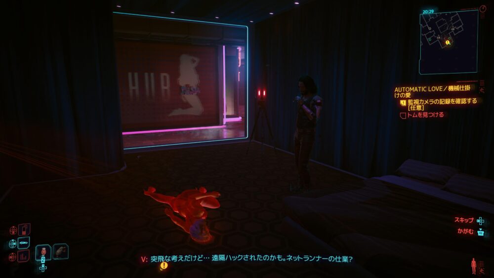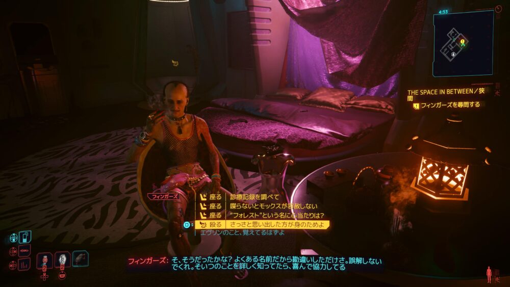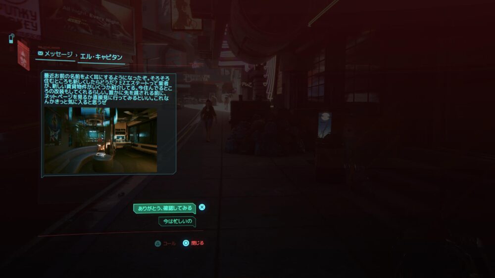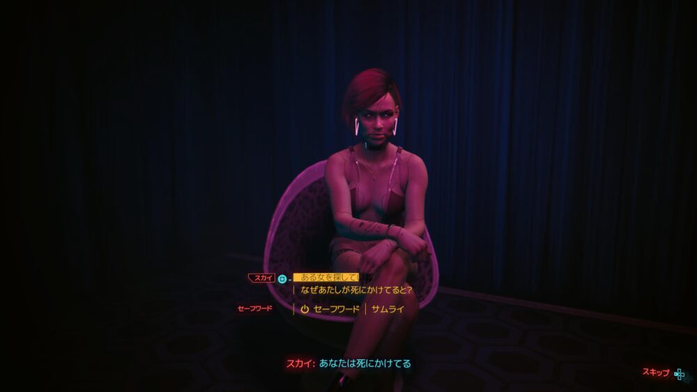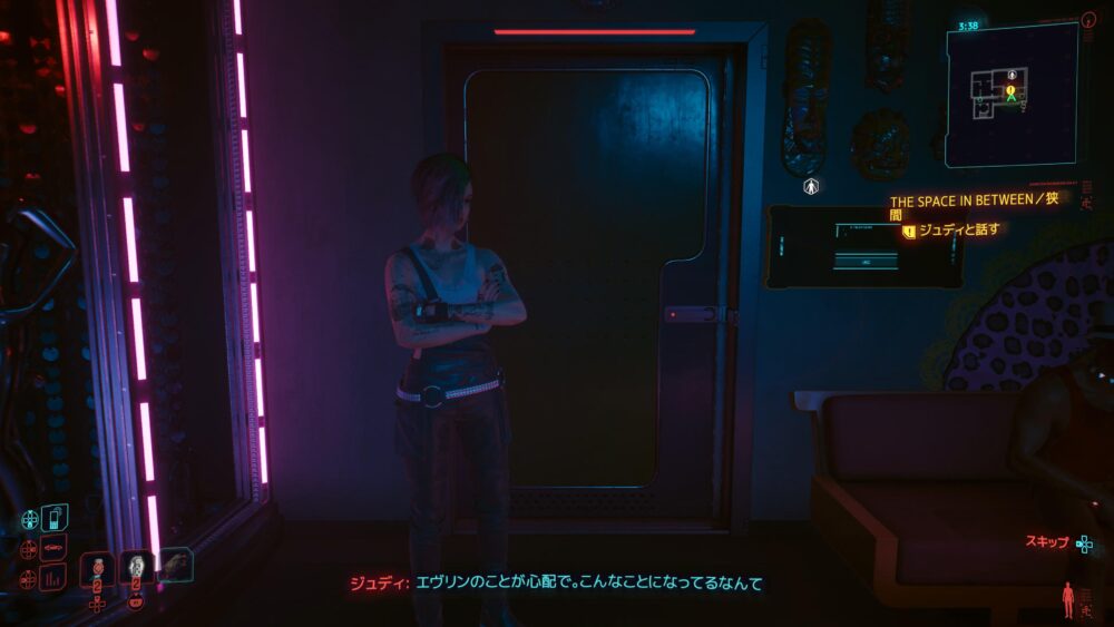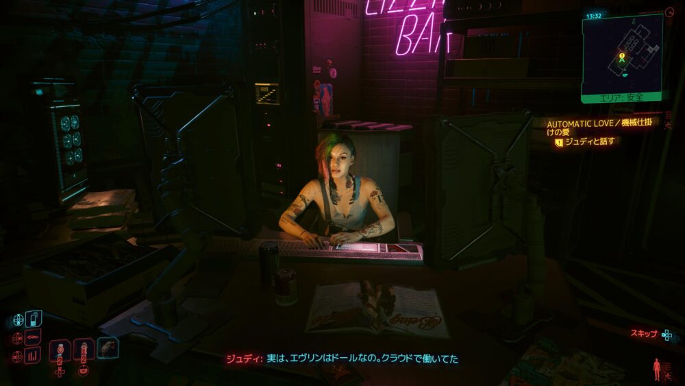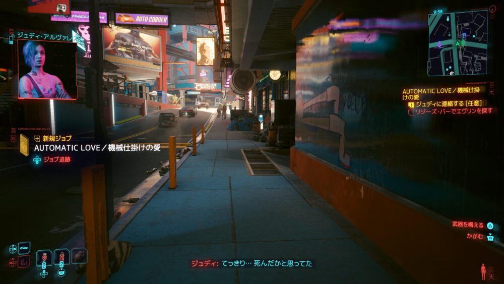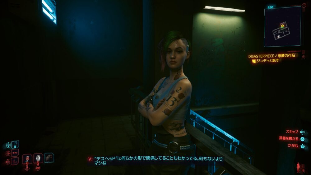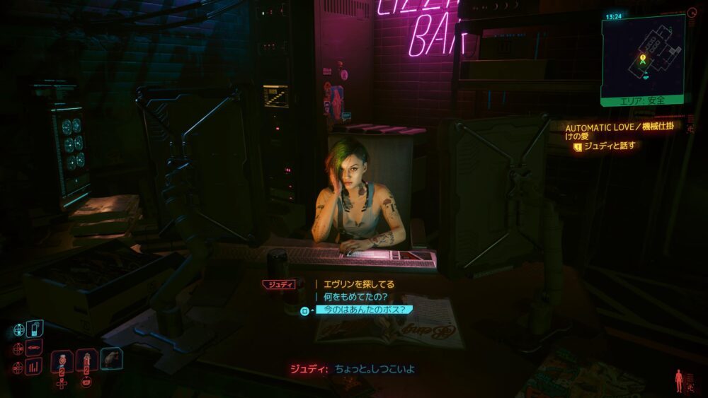 エヴリンと最後に連絡を取ったのはRelicを盗み出して、ジャッキーの頭にチップを入れたとき……だったはず。エヴリンはデクスを介さずにVからチップを受け取る予定だったけど、音信不通になっちゃった。その唯一の手掛かりを持っているのが、エヴリンの友人であるジュディです。