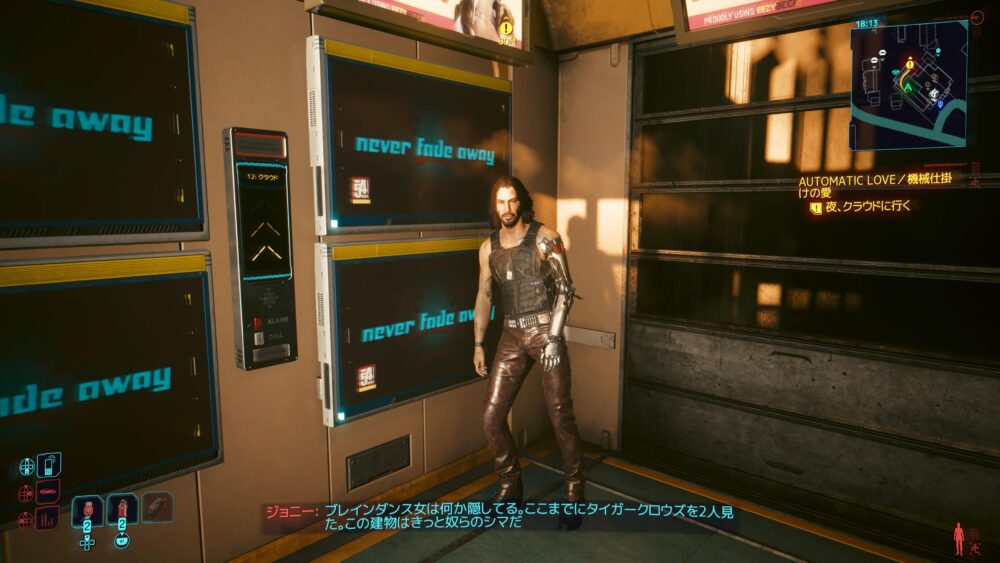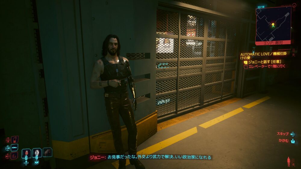 キアヌが出ることはプレイ前から知ってたんですけど、まさか主人公の脳内に住み着くキャラだったとは。ジョニーはアラサカ社に核を落として相当な被害を出したテロリストなんですよね。