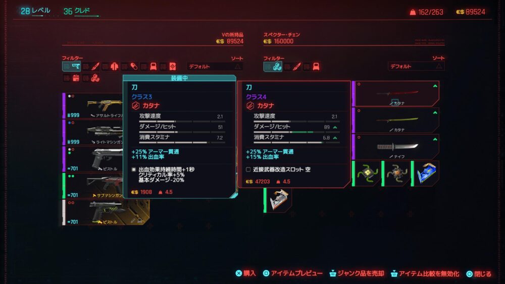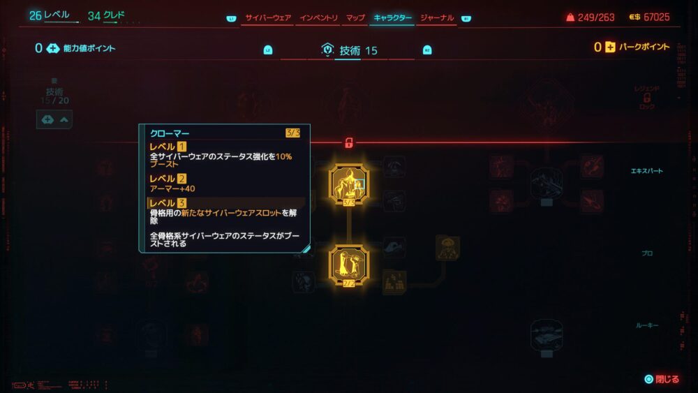 技術を上げて、サイバーウェアに特化したビルドにもしたいな~と迷走中。いわゆる装備にあたるのがサイバーウェアなので、その性能を上げたほうが強くなれるじゃん? あとは肉体にあまり振らないまま接近戦をしてるので、サイバーウェアを強化することで耐久を確保したいという考えもありますわね。