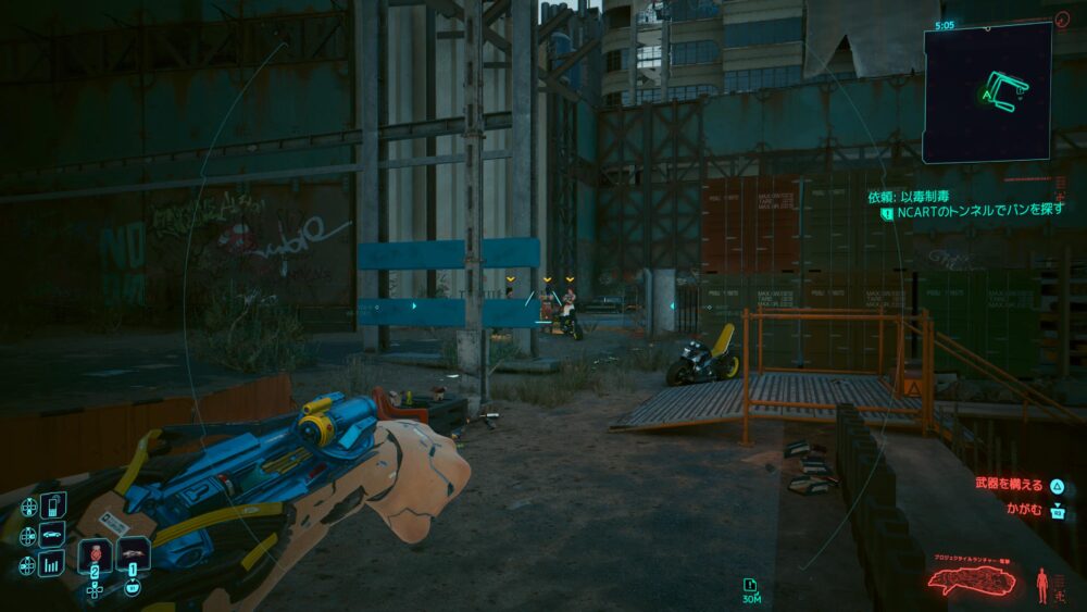 新しくつけた腕のサイバーウェア、プロジェクトランチャーです。ランチャーッ!! ちなみにわけのわからない方向に飛んでって当たらなかった。癖があるなあ。