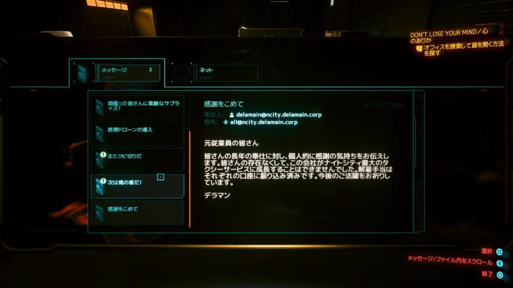 その途中でメールを見てたんだけど、デラマンAIがタクシー会社そのものを運用するようになってからは生きた人間は全員解雇されて、退職金を振り込まれたんですね。まさに人間の危惧するAI社会~。