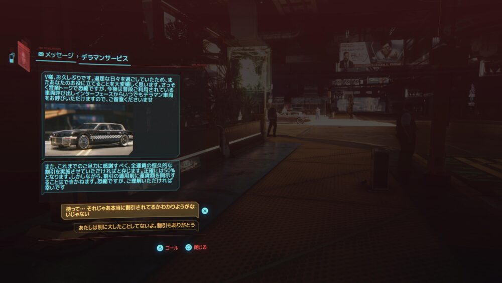 営業トークと、タクシー代の割引がされるそうです。というかタクシーとして呼べたりしたの? 初めて知りました。このジョブのクリア報酬なのかもしれない。