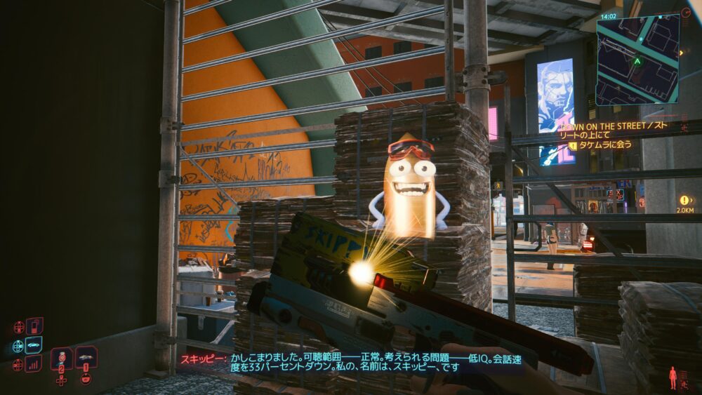 裏路地を歩いてたらスキッピー、という銃を拾いました。なんか変なドングリがゴーグルつけてる。特別なAIが仕込まれていて、銃を取り出すとしゃべるみたいです。わけがわからん……AIに縁があるね。