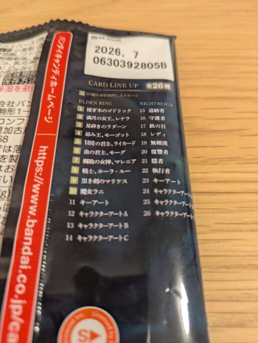 パッケージはエルデンリングと、スピンオフのナイトレインの二種。我が家は謎にナイトレイン率が高かったです。まあ、中身には関係しないでしょう。