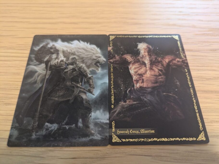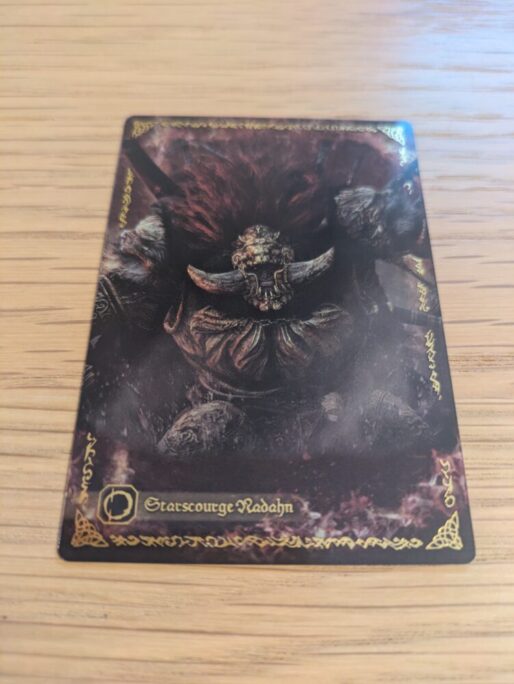 こちらはデミゴッドの一人、星砕きのラダーンです。大ルーン所持者は左下に大ルーンのマークが箔押しで入っててかっこいいです。あと、金箔の囲いがキャラに被らないようになってるのが芸が細かくてとても感心しました。