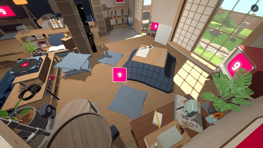 小上がりの隣にキューブを重ねて柱を作ったんですが、上の方が発光する。これなに……? 特に照明家具があったりしないんだけど、部屋の天井の中心から光るようになってるのかな? ようわかりませんがその照り返しをキューブが浴びているようで、めっちゃ眩しいです。