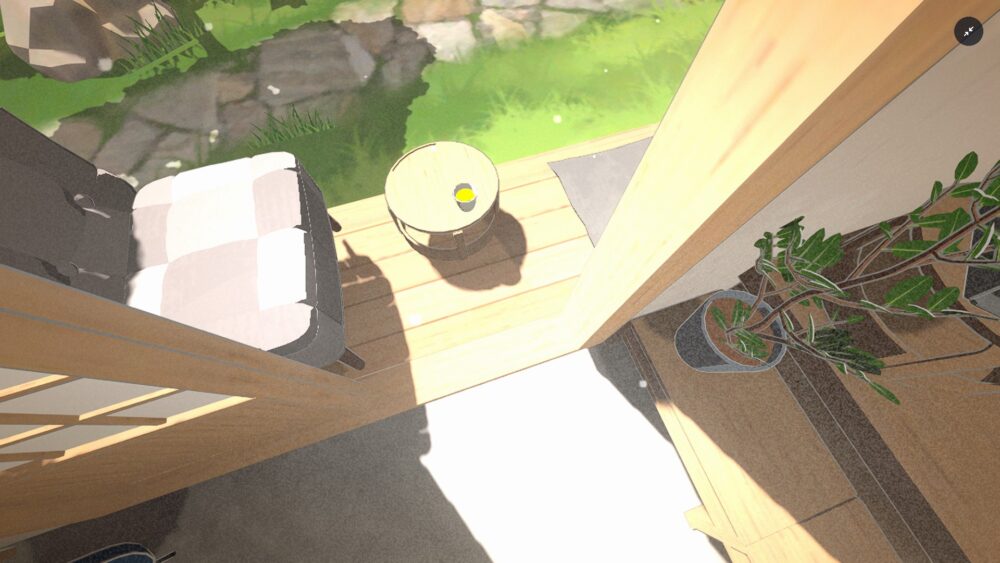 縁側はシンプルにチェア、座布団、ローテーブル。というか一部分しか見えないので変に凝った装飾をしてもしゃーない。