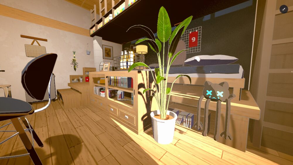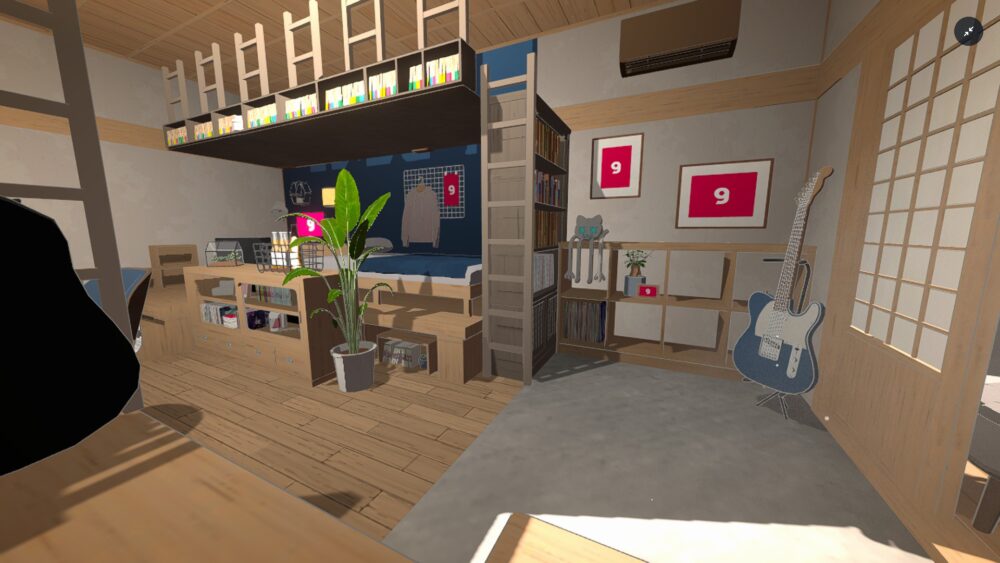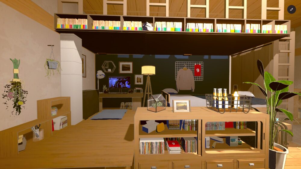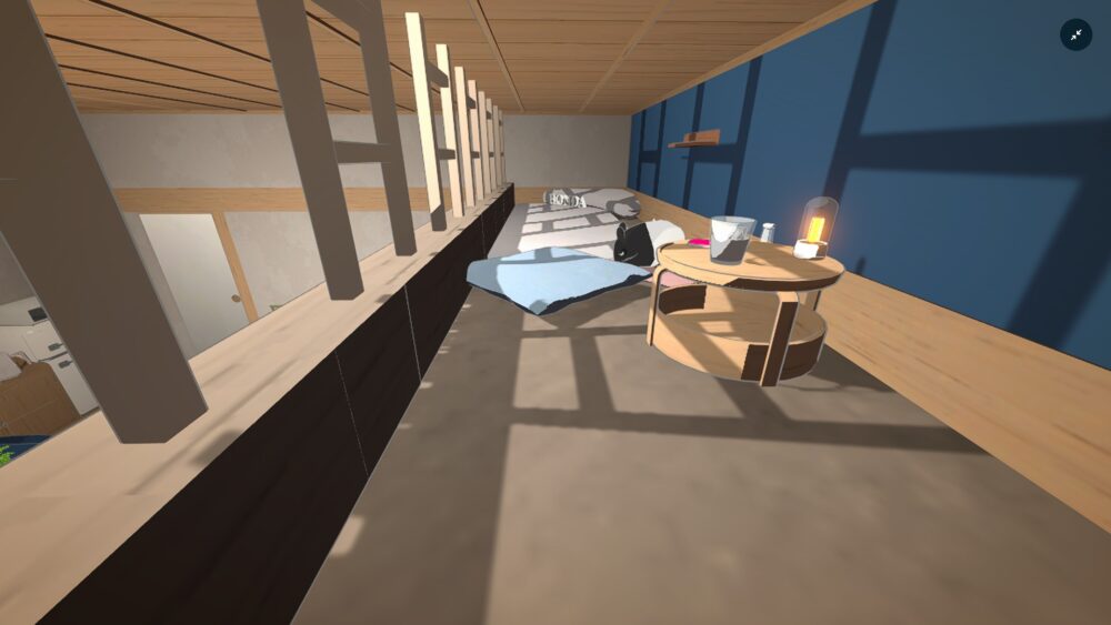 ロフトの下の小上がりにはベッドを置きました。寝る場所多すぎない? って感じだけど、マジでベッドにアバターが転がってるのかわいいから……二か所くらいで寝られるようにしたくなる。なるよ。