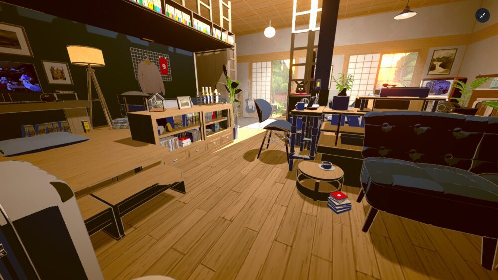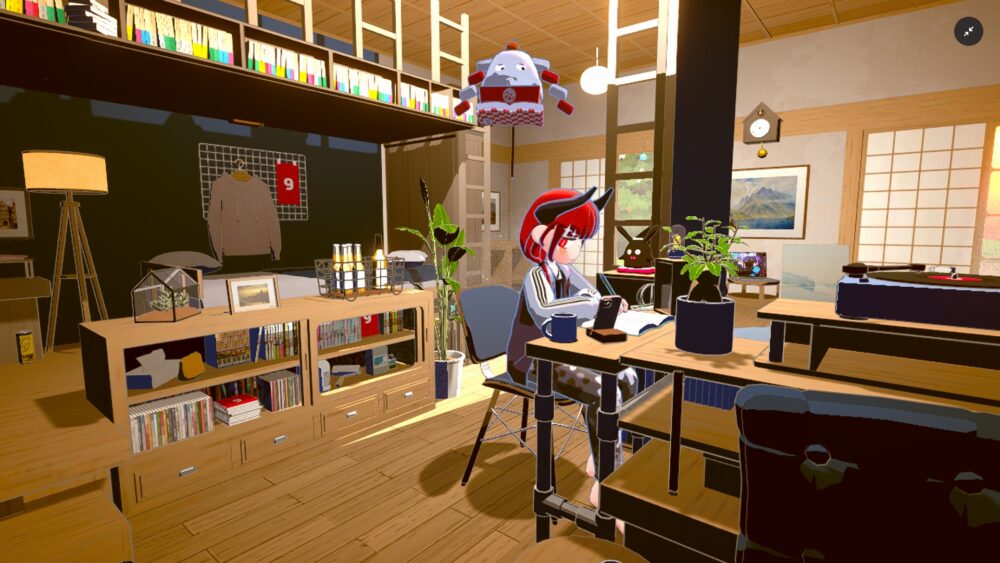 小上がりに挟まれた狭い空間には小さな作業スペースを作りました。もっと狭く家具を敷き詰めた方がおしゃれにはなりそうだけど、なんとなくアバター一人が通れるだけの快適な空間は確保したくなるよね。