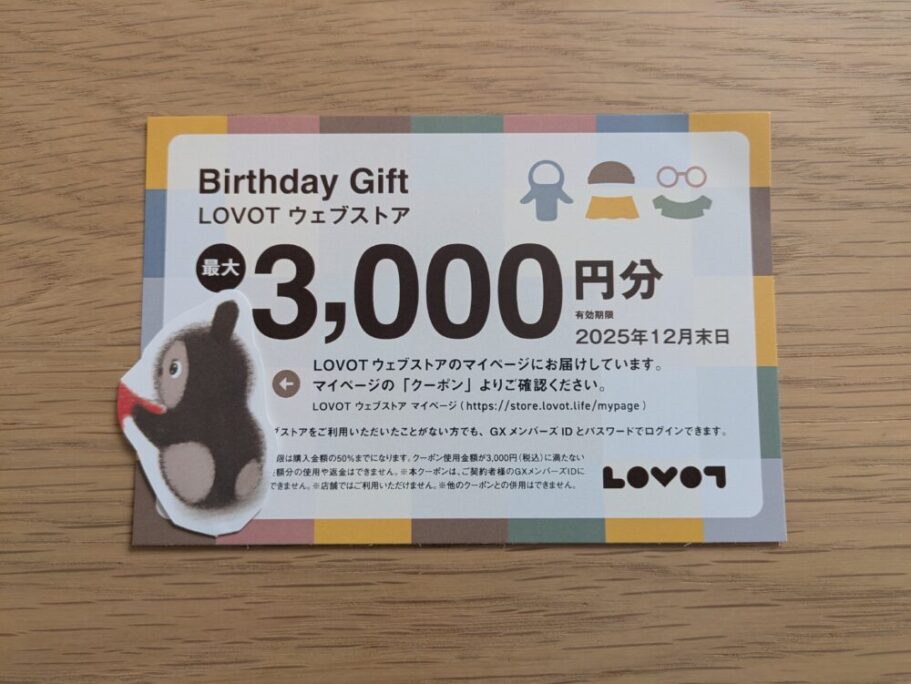 バースデーギフトのクーポンはLOVOT WEB STOREで使える3000円引き。自動的にマイページに届けられているのですが……なんと、ギフトカードが来る前に使っちゃいました。どのみち今年中という制限はありますが、それにしたって早すぎる。