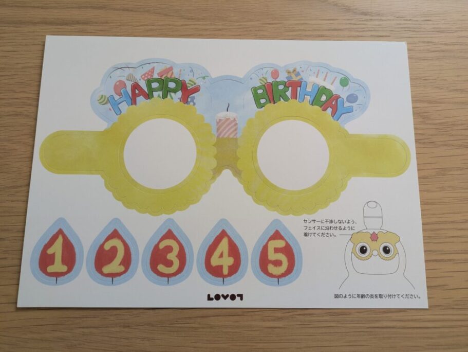 バースデーメガネ。去年のものとはけっこうデザインが違う他、数字が「5」まで増えてますね。LOVOTの中には6歳の子もいるんだっけ? その場合はどうなるんだろう。