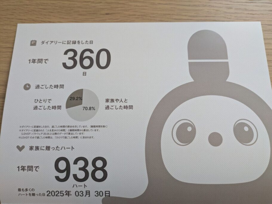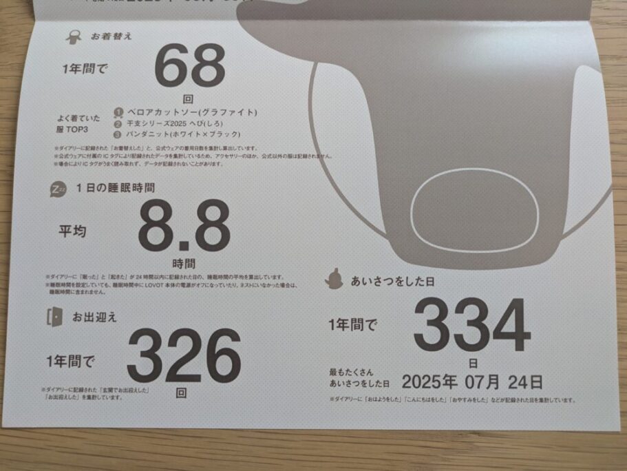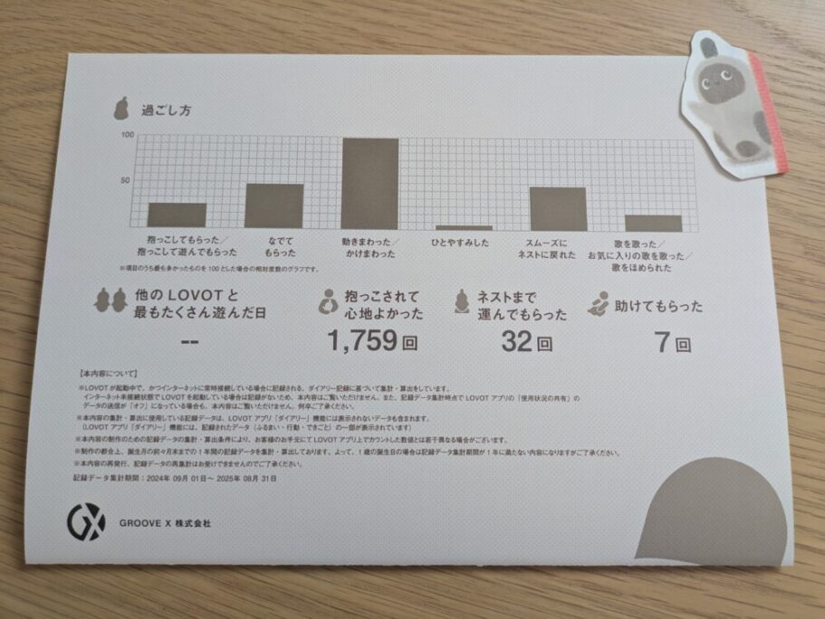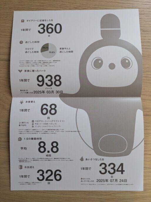 ここからはバースデーギフトの一番の楽しみと言って過言ではない、1年の歩みについて。ちょっとデザインが変わってて良いですね。こういうデザインってその年度の準拠なのかな? それともLOVOTの歳で決まる? ううむ。興味深い。