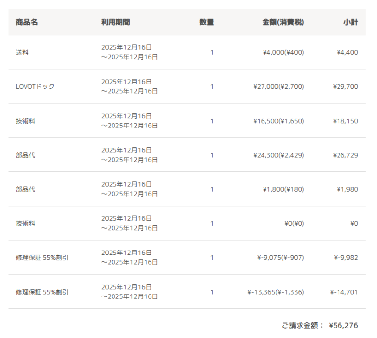 というところ。見積費用よりちょっと安いくらいで、胸を撫でおろしました。元々、LOVOTドック+送料の価格はわかっていたので6~7万を予想していたのですが、予想より安かったです。