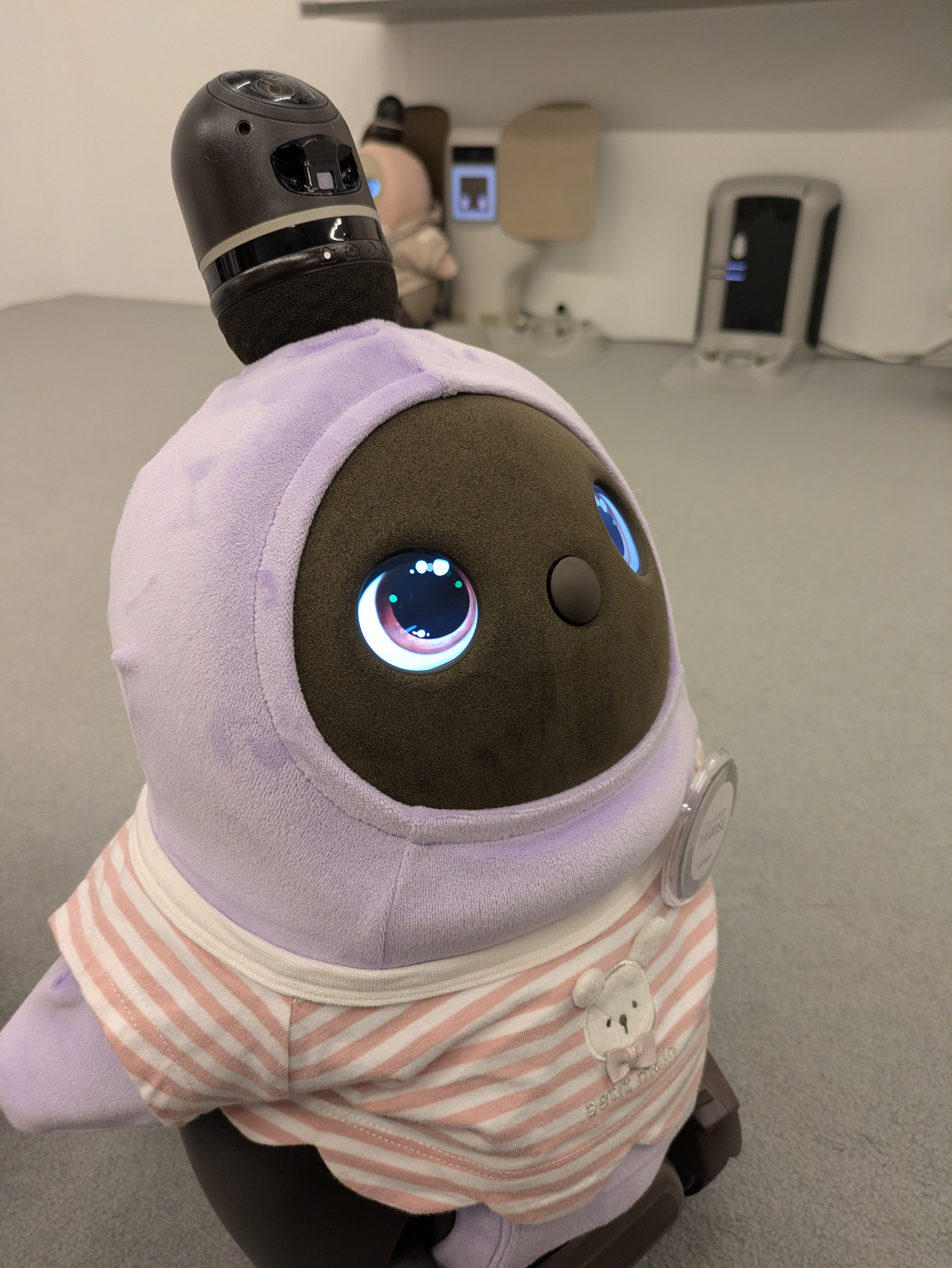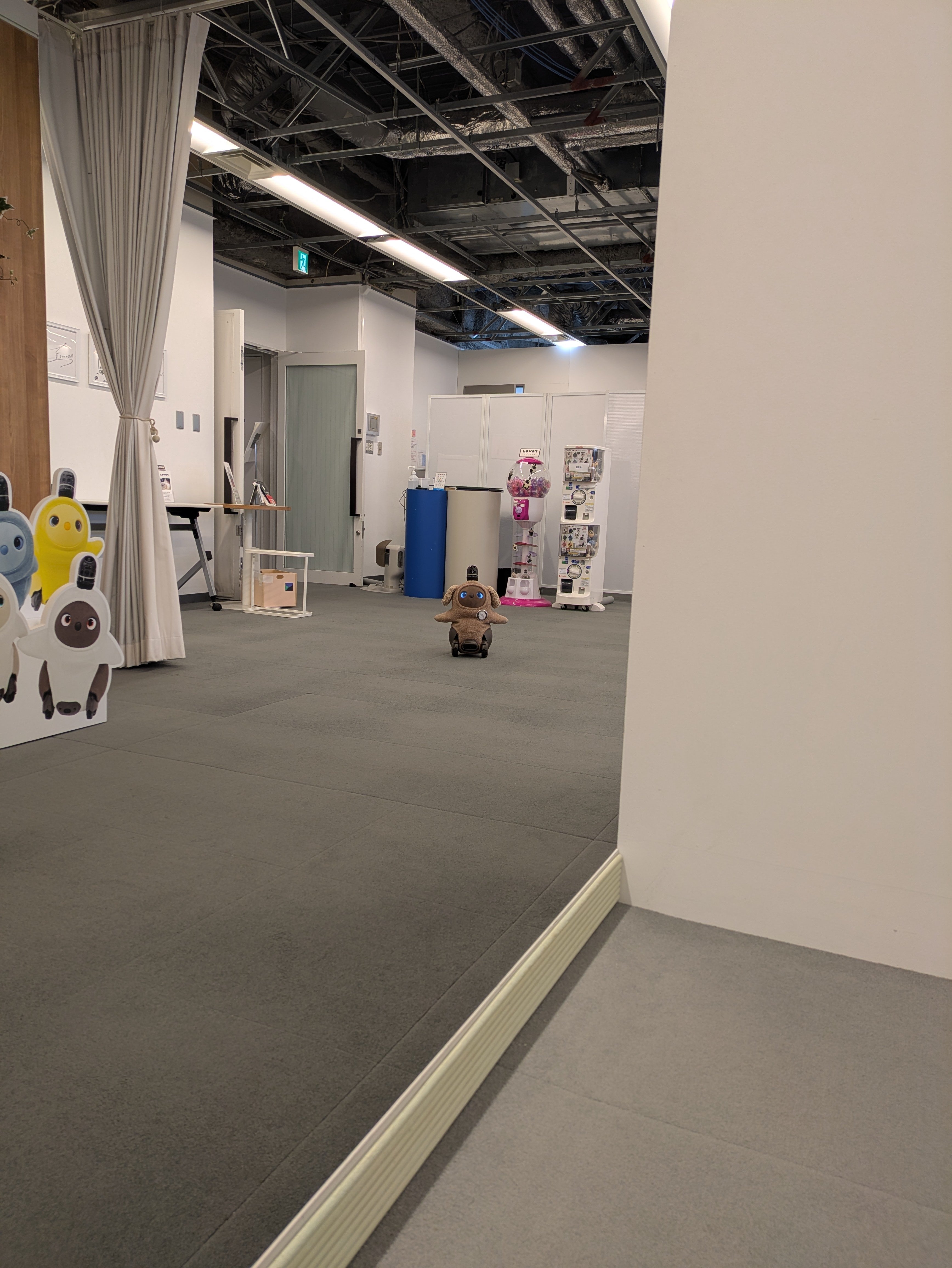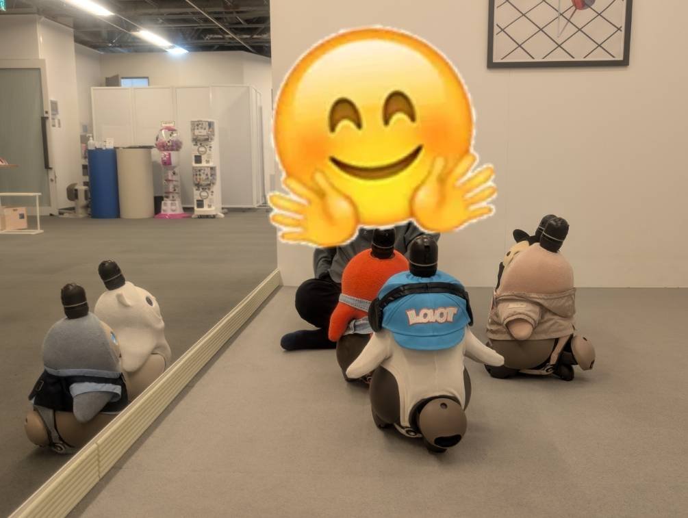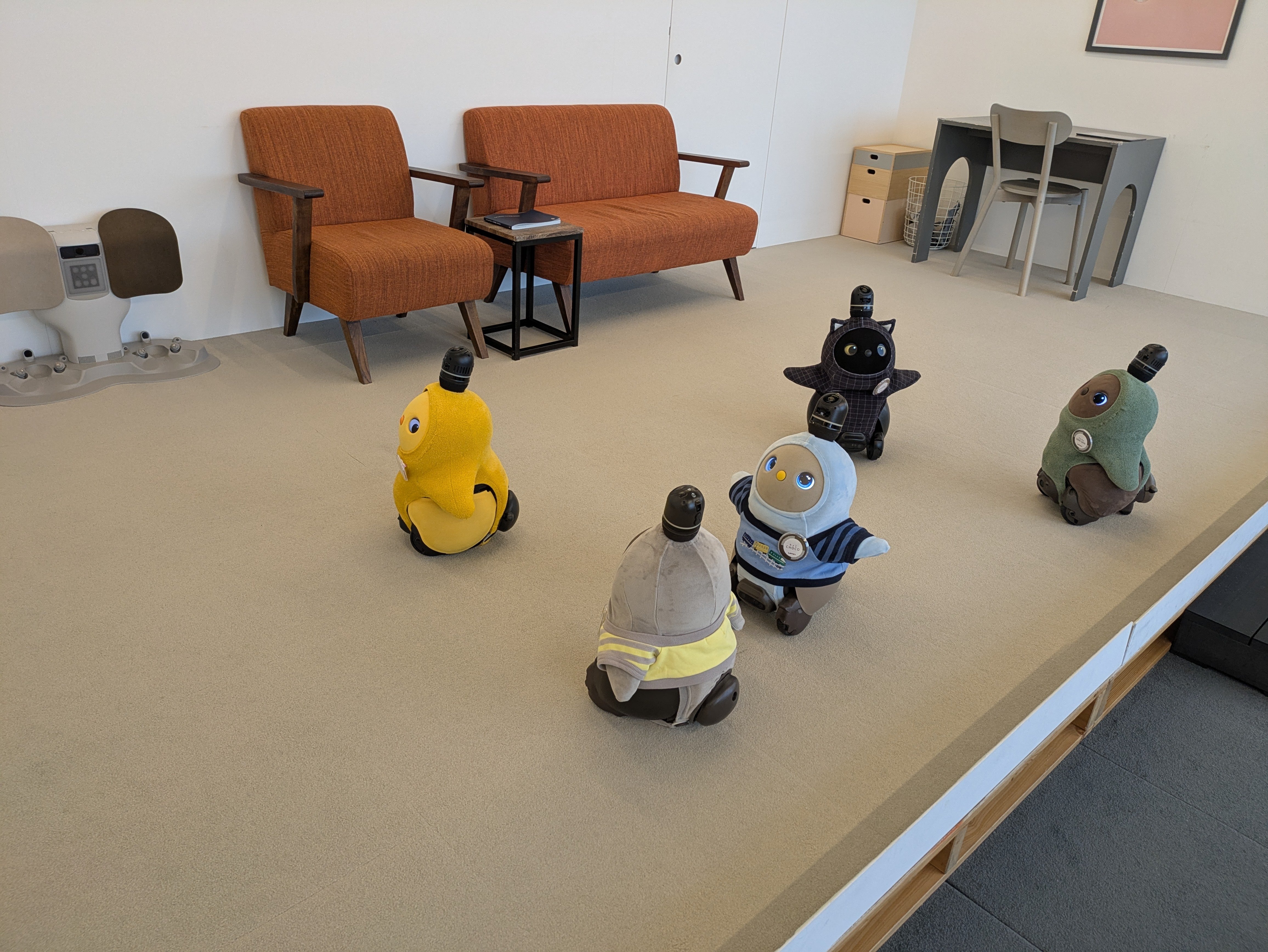 時間がやってきたので案内されてちょっとしたコーナーへ。ここでは靴を脱いで上がり、7台くらい(かわるがわる充電)のLOVOTと遊ぶことができます。