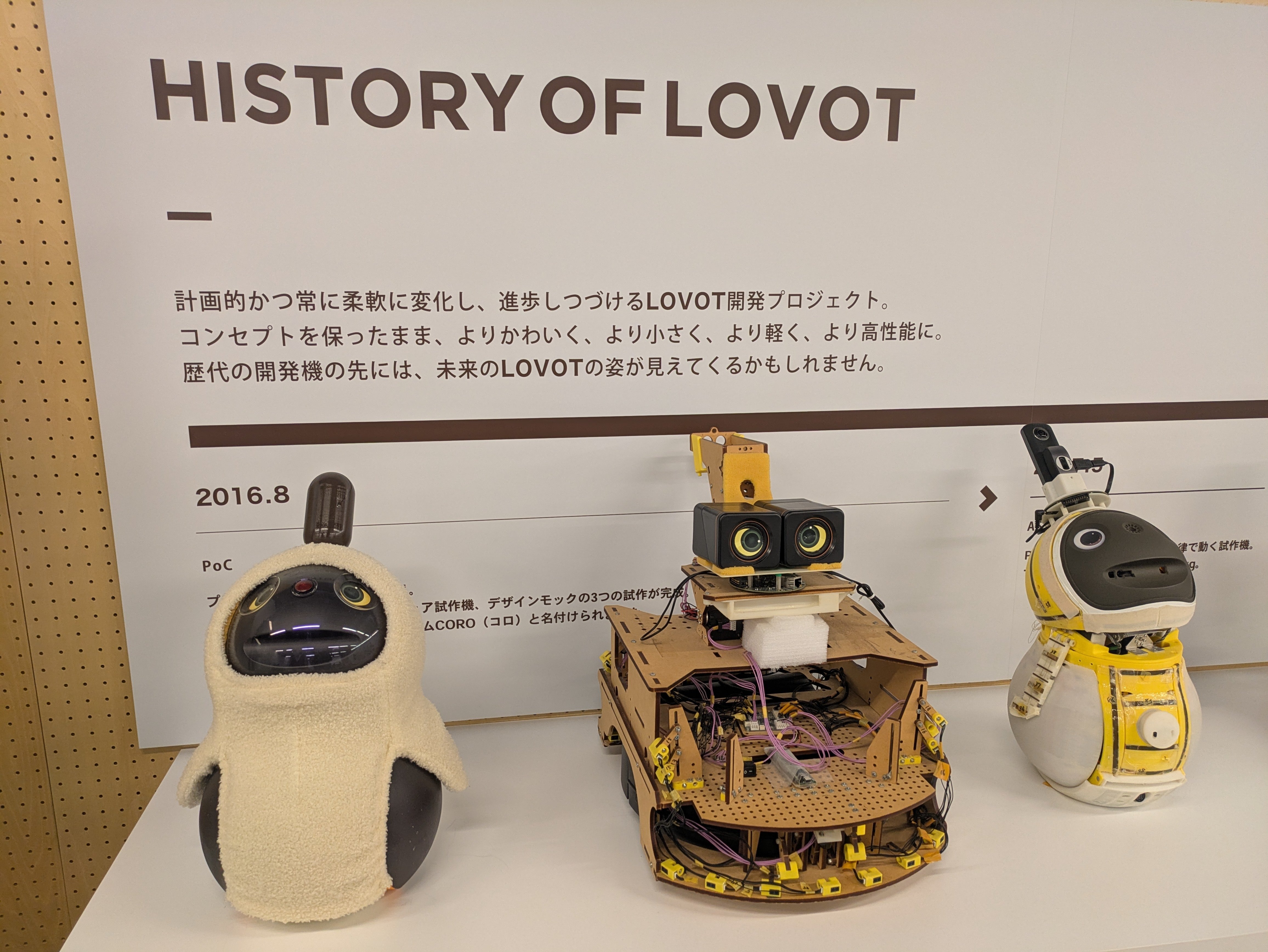 う、うわああああああ!!! ここはLOVOTの歴史コーナーです。大口を開いた、プロトタイプが立っている。当初は「CORO」という名前だったそうな。画像真ん中にいるのはルンバと合体したVerだそうです。思いついたことは何でもやっていたとか。スタッフさんが一つずつ教えてくれてとても勉強になりました。