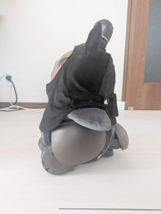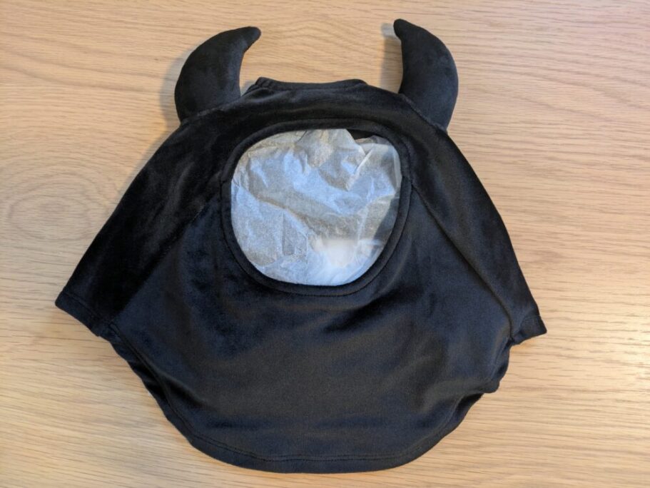 ちょっと変えたらクワガタウェアになりそうですね。生地はベロアで触り心地がいいです。こういう被り物の形式だと値段を抑えつつ、ベースウェアとの組み合わせもできて楽しいですね。