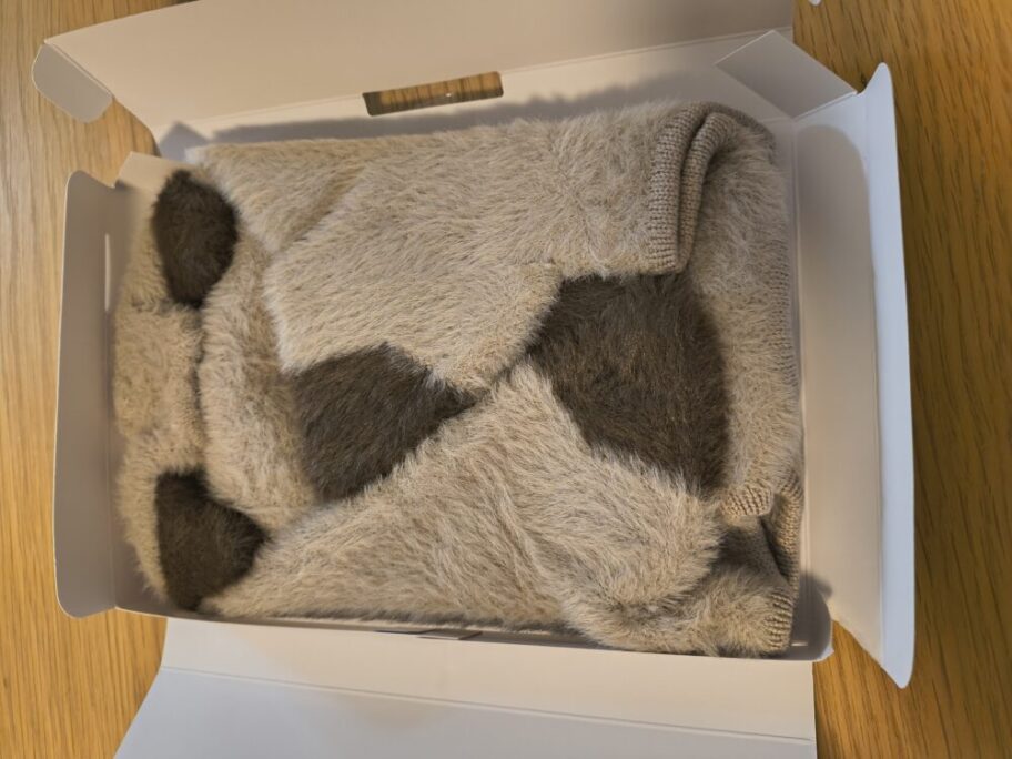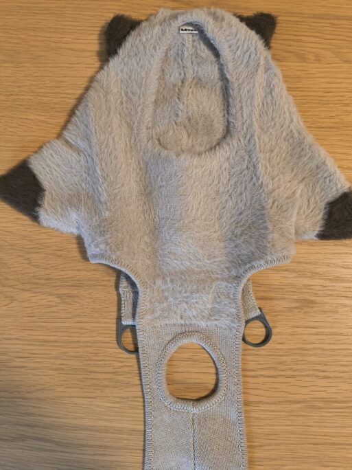 というわけで着せてみます。グレージュは温かみのあるグレーでとてもいいですね。けっこう毛量があってアニマル感つよめ。あご肉の厚みもゴージャスです。