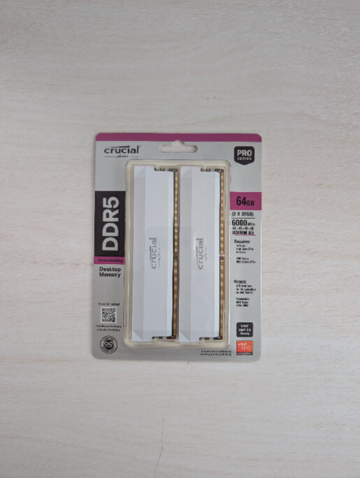 今回は若干予算に余裕があったため、Crucial CP2K32G60C40U5W 64GB(32GB × 2枚組)セット DDR5-6000を採用。今回のマザーボードではAMD EXPOという設定を使用できるため、OCメモリだがチャレンジしてみることにした。あとは色が白くて光らないから。