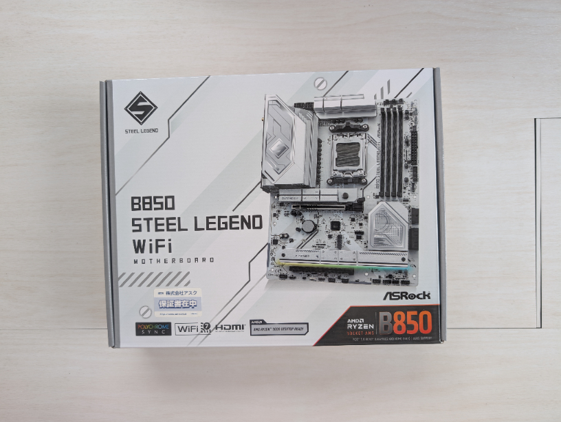 今回はAMD Ryzen 7 9800X3Dが十全な能力を発揮できること・USB Type-Cの数や転送速度はそこまで重要視していないこと・GPUと内臓キャプチャーボードがギチギチにならずに付けられること・なるべく白いマザーボードにしたかったことからASRock B850 Steel Legend WiFiを採用した。