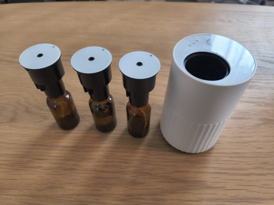 こんな感じで取り換え用ボトルを上からそのまま押し込んでセットします。逆に外すときは、リュクス本体の下部から指で押して外します。超簡単。うちは取り換え用ボトル二本にそれぞれ無印良品の「おやすみブレンド」と「ライム」を入れているので、気分で取り換えて使用してます。
