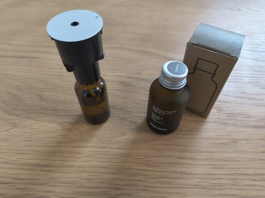 本体に取り換え用ボトルを差して使うことになるので、このボトル二本には元々所持していた無印良品のエッセンシャルオイルを入れてます。