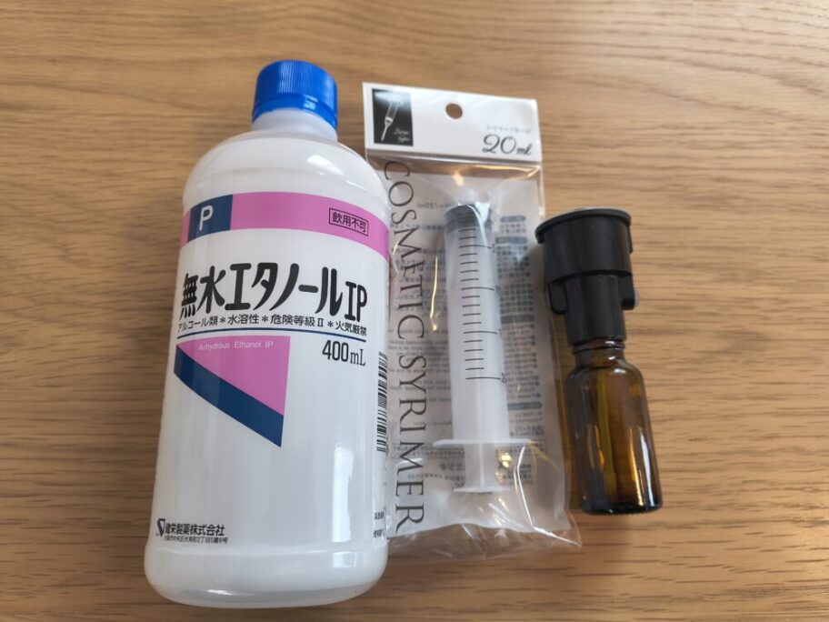 残りの一本のボトルは洗浄用です。リュクスは一週間に一回、エタノールを入れて噴霧することで本体を洗浄できるようになってます。なのでこの注射器的なやつでエタノールをボトルに入れておいて、一週間に一度2時間ほど噴霧して洗浄します。水で何かのパーツを洗ったり、分解したりする必要がなくて手軽ですね。