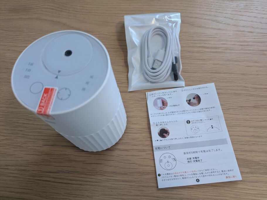 開けてみるとこんな感じ。USBケーブルと説明書、本体+取り換え用ノズルです。ちなみに本体色は五色くらいから選べたんですが、ホワイトにしてみました。使いやすそうだし。