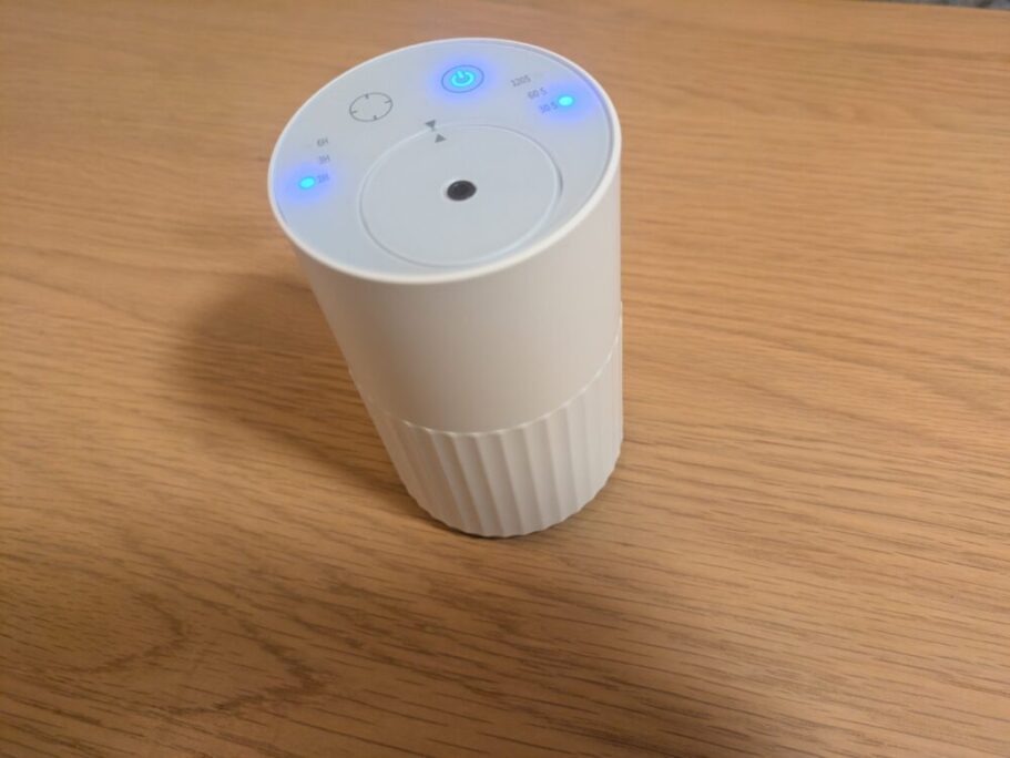 コードレスで持ち運べるアロマディフューザーで、水いらず。エッセンシャルオイルを霧状にして噴射する、ネブライザータイプというものになります。必然的に水を入れたりする必要もなく、USB給電なので一々使うときにコードを抜き差ししなくて良し! お値段は9000円とけっこう高価でしたが、誕生日という機会にプレゼントしてもらいました。