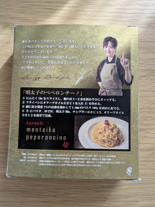 箱が去年と違って金色になってる。裏面には「明太子のペペロンチーノ」のレシピが載ってます。せっかくだから近いうちに作りたいと思います。