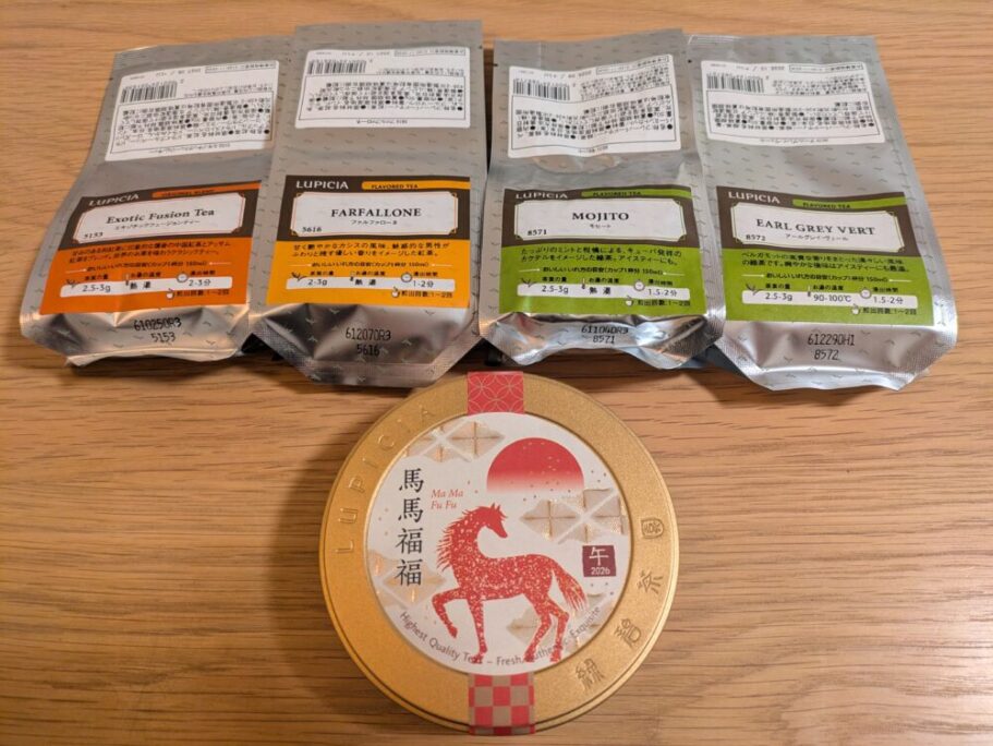 LUPICIAでは干支の紅茶と緑茶を売ってます。限定缶に入っててカッコいい。昔は緑茶の方も買ってたんですが、紅茶の方が好きなのでここ二年くらいは紅茶だけ買ってると思います。